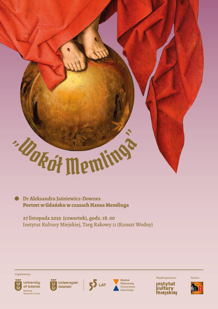 Centrum Badań Memlingowskich UG serdecznie zaprasza na nowy cykl wykładów popularno-naukowych zatytułowany „Wokół Memlinga”. W kolejnych miesiącach, w każdy ostatni czwartek o godz. 18.00 zapraszamy do Instytutu Kultury Miejskiej w Gdańsku, w Kunszcie Wodnym. Wykłady poświęcone twórczości Hansa Memlinga i jemu współczesnym wygłoszą naukowcy z Instytutu Historii Sztuki, Instytutu Historii UG oraz zaproszeni goście. Wykłady będą nagrywane i udostępniane na kanale YouTube – Video WMG.