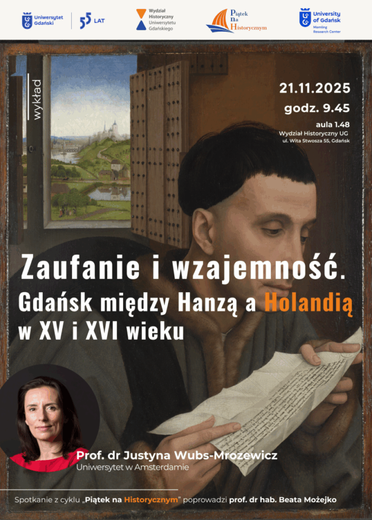 W piątek 21 listopada 2025 r., na zaproszenie Dziekana WH dr. hab. Arkadiusza Janickiego, prof. UG oraz Dyrektorki Centrum Badań Memlingowskich UG prof. dr hab. Beaty Możejko, gościliśmy podczas „Piątku na Historycznym” Prof. dr Justynę Wubs-Mrozewicz z Uniwersytetu w Amsterdamie.